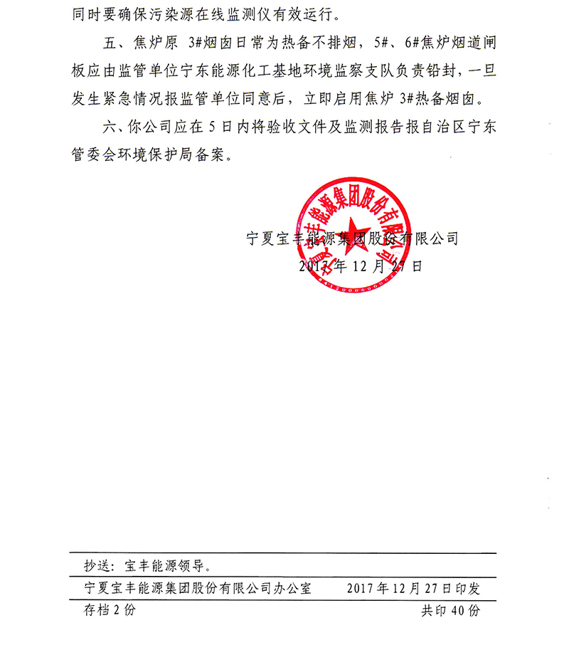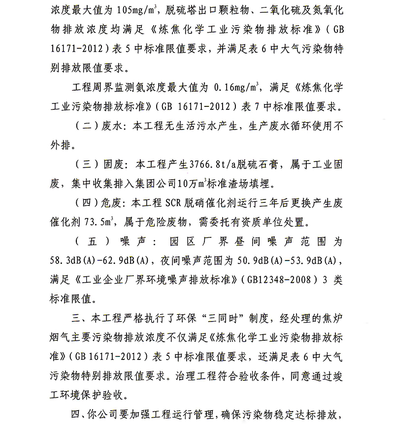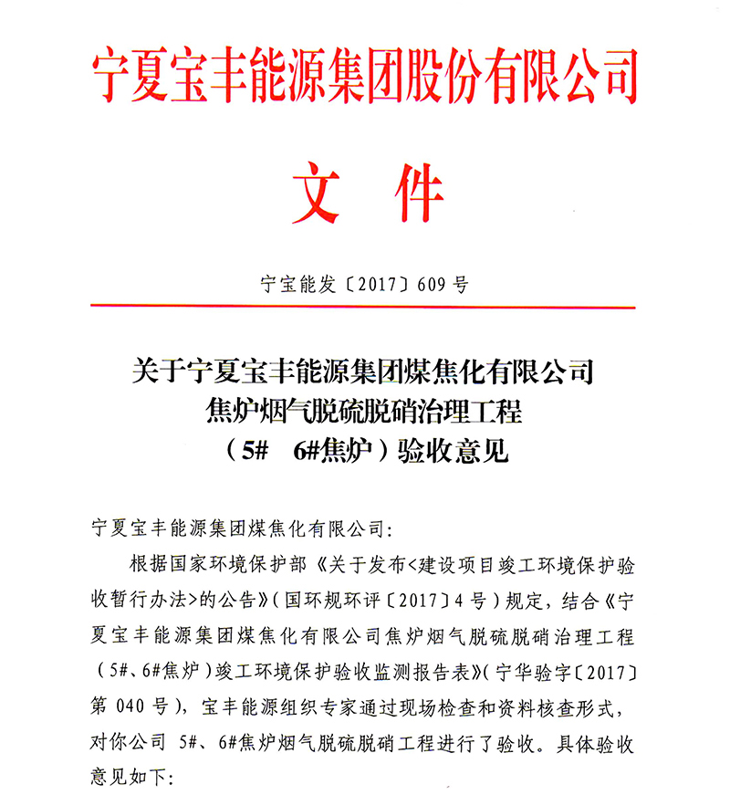 关于宁夏宝丰能源集团煤焦化有限公司焦炉烟气脱硫脱硝治理工程(5# 6#焦炉)验收