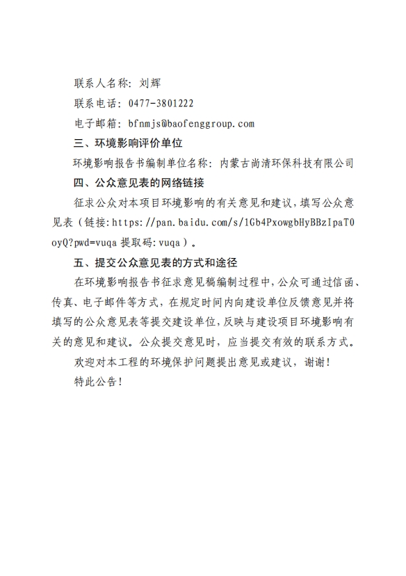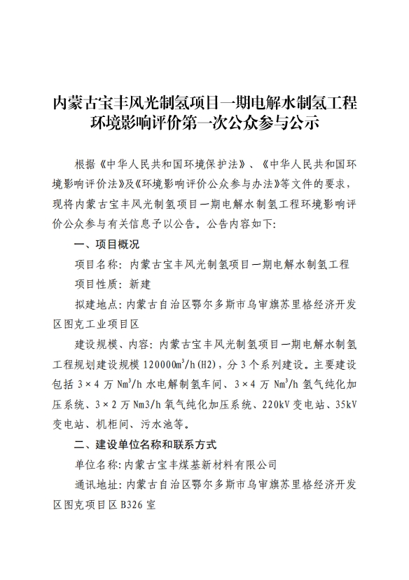 内蒙古宝丰风光制氢项目一期电解水制氢工程环境影响评价第一次公众参与公示